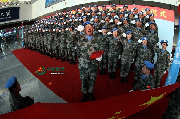 The officers and men of the 13th peacekeeping contingent are taking oath in front of the Chinese national flag at the expeditionary ceremony. 100 officers and men of the first echelon of the 13th Chinese peacekeeping contingent left the Ji'nan Yaoqiang International Airport for the Wau mission area in South Sudan on November 18, 2014, to carry out an eight-month-long peacekeeping mission. (Chinamil.com.cn/Qiu Chengliang)