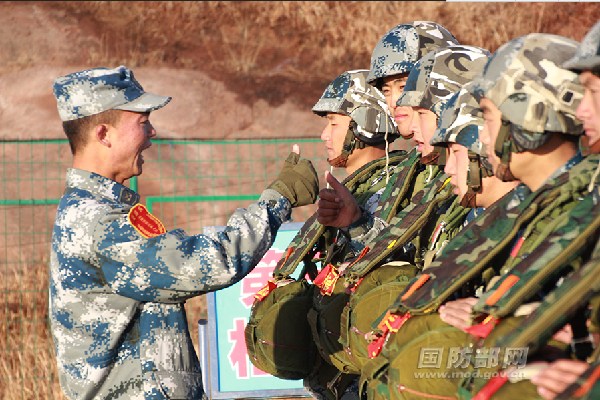Political instructor is encouraging the recruits before training. An airborne division of the Air Force of the Chinese People's Liberation Army (PLAAF) organized thousands of recruits to conduct large scale parachuting training in cold winter for the first time on December 17, 2014. According to sources, the new paratroopers will conduct the parachuting training on such complicated subjects as night parachuting and armed parachuting immediately afterwards. (mod.gov.cn/Jiang Long)