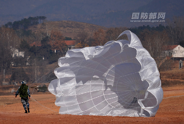 A paratrooper lands safely. An airborne division of the Air Force of the Chinese People's Liberation Army (PLAAF) organized thousands of recruits to conduct large scale parachuting training in cold winter for the first time on December 17, 2014. According to sources, the new paratroopers will conduct the parachuting training on such complicated subjects as night parachuting and armed parachuting immediately afterwards. (mod.gov.cn/Jiang Long)