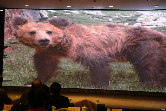 Photos of a brown bear found by the 2014 expedition in Yanzhanggua Canyon on the Qinghai-Tibetan Plateau of China are shown at the Beijing press conference on the wildlife of Yanzhanggua Canyon on Jan 14, 2015. [China.org.cn]
