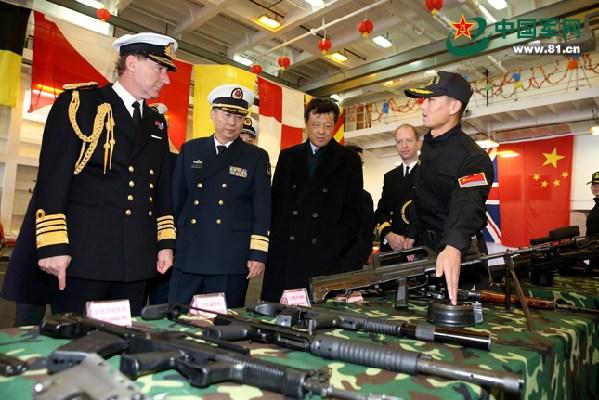 A special operation member is introducing equipment to Admiral Jeorge Bellas. Four-Star Admiral Jeorge Bellas, British Sea Lord, came to visit dock landing ship "Changbaishan" of the 18th escort taskforce of the Navy of the Chinese People's Liberation Army (PLAN) accompanied by Liu Xiaoming, Chinese Ambassador to UK on January 15, 2015.
