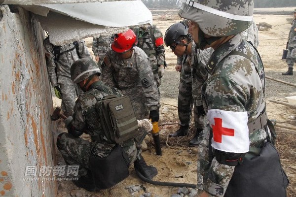 The US-China Joint Humanitarian Assistance and Disaster Relief Exercise entered the actual troop drilling phase in Haikou city, south China's Hainan province, on January 18, 2015.