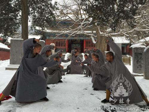 Shaolin Temple ushered in the first snow this year on Jan 28, 2015. The snow ended early the next morning. Despite the bone-chilling cold, the monks in the temple practiced martial arts as usual in the snow. (Photo/shaolin.org.cn)