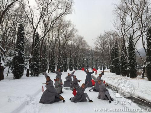 Shaolin Temple ushered in the first snow this year on Jan 28, 2015. The snow ended early the next morning. Despite the bone-chilling cold, the monks in the temple practiced martial arts as usual in the snow. (Photo/shaolin.org.cn)