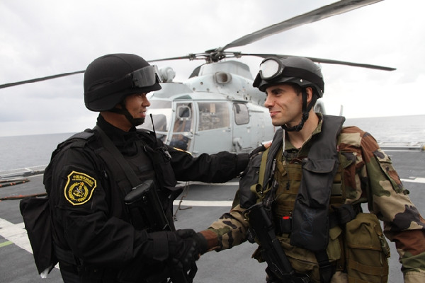 The special operation members of China and France have a friendly exchange during a joint drill. The guided missile frigate "Yuncheng" of the 18th escort taskforce of the Chinese People's Liberation Army Navy (PLAN) and the guided missile frigate "Commandant Birot" of the French Navy conducted joint drill in the Gulf of Hyeres near the naval port in Toulon of France on February 13, 2015, local time. (Chinamil.com.cn/Liao Yufei)