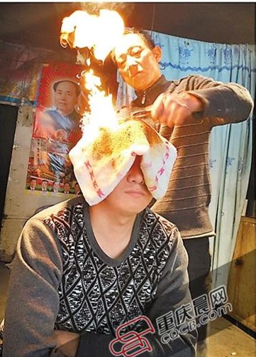 Liu Zebing, a traditional Chinese medicine (TCM) practitioner, treats a man suffering from headache with cupping therapy, in Yongxin town, Southwest China's Chongqing municipality. Liu, 59, learned cupping therapy from a TCM practitioner while working as a coal miner in Guizhou at 16. Liu claimed to be able to cure chronic headache with his "fire treatment."(Photo/Chongqing Morning Post)