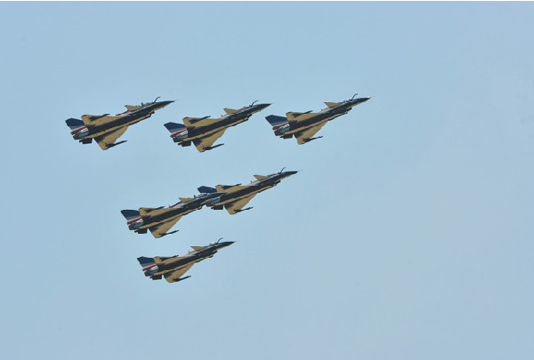 Six J-10 fighters of the Bayi Aerobatic Team form a wedge formation in an aerobatic flight in Langkawi, Malaysia on March 17.