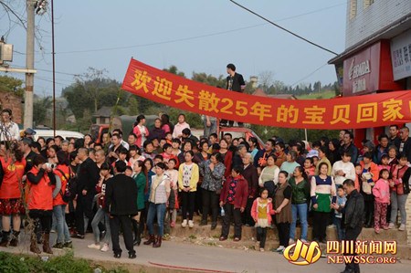 Their reunion makes the whole village excited. Villagers carry a banner reading "25 years' missing; Welcome home, Dear." (Photo/newssc.org)