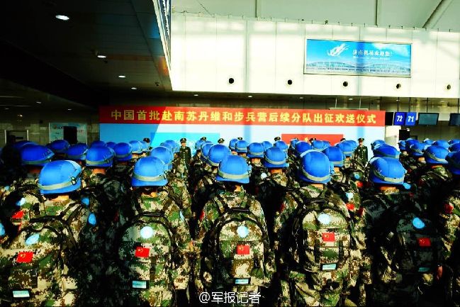 The last batch of 130 soldiers of China's peacekeeping infantry battalion to South Sudan set off by a charter flight from the Jinan International Airport in Jinan, capital of east China's Shandong province on April 7, 2015. The 130 Chinese peacekeepers, dispatched by the PLA Jinan Military Area Command, are expected to arrive in the war-torn African country on Wednesday. The 700-member battalion comprises three infantry companies and one supply company. (Photo: www.81.cn/Li Aiming)