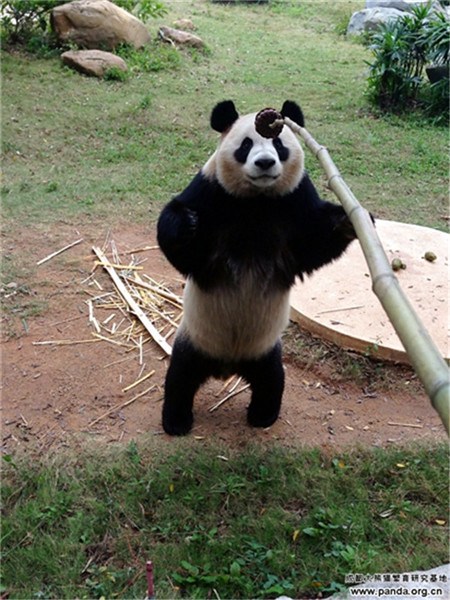 Panda "Yuan Zhou" stands up on his hind legs to reach food, making him look like a boxer. "Yuan Zhou", a male giant panda, was born in 2010. He is kept at the Chengdu Research Base of Giant Panda Breeding in southwest China's Sichuan province. (Photo/Chengdu Research Base of Giant Panda Breeding)