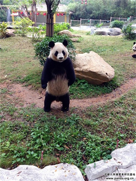 Panda "Yuan Zhou" stands up on his hind legs to reach food, making him look like a boxer. "Yuan Zhou", a male giant panda, was born in 2010. He is kept at the Chengdu Research Base of Giant Panda Breeding in southwest China's Sichuan province. (Photo/Chengdu Research Base of Giant Panda Breeding)