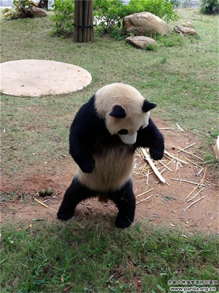 Panda "Yuan Zhou" stands up on his hind legs to reach food, making him look like a boxer. "Yuan Zhou", a male giant panda, was born in 2010. He is kept at the Chengdu Research Base of Giant Panda Breeding in southwest China's Sichuan province. (Photo/Chengdu Research Base of Giant Panda Breeding)