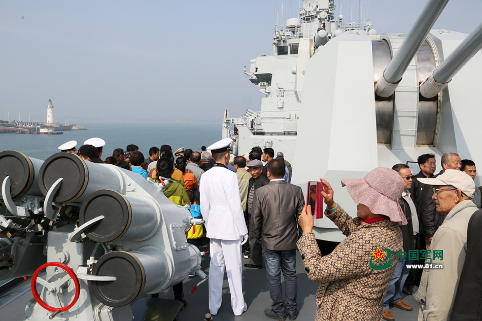 Citizens visit the guided missile destroyer Harbin.The guided missile destroyer Harbin of the North China Sea Fleet of the PLA Navy opened to the public at the Qingdao Olympic Sailing Center in east China's Shandong province on April 23 to celebrate the PLA Navy's 66th founding anniversary.