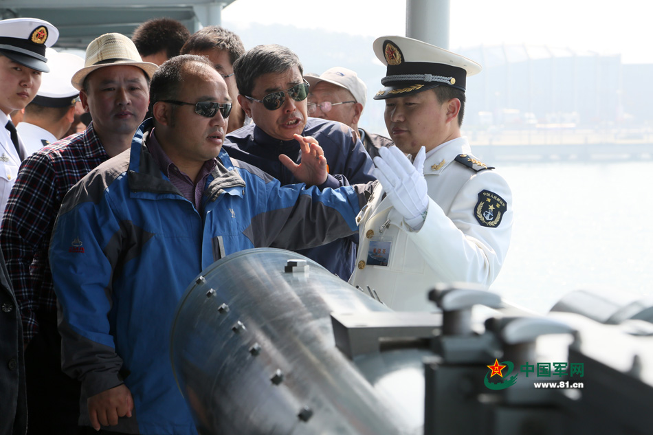 A Navy officer introduces the warship to citizens.The guided missile destroyer Harbin of the North China Sea Fleet of the PLA Navy opened to the public at the Qingdao Olympic Sailing Center in east China's Shandong province on April 23 to celebrate the PLA Navy's 66th founding anniversary.