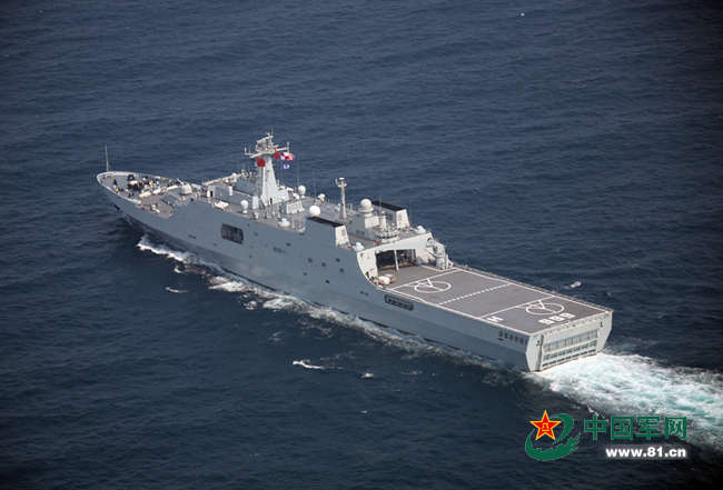 USS Blue Ridge and a ship-based helicopter are seen in a China-U.S. joint military drill on April 24, 2015. The amphibious transport dock ship Jinggangshan of the Chinese Navy's South China Sea Fleet and USS Blue Ridge, the command ship of the U.S. Navy 's Seventh Fleet, held a joint military drill focusing on maritime search and rescue at a sea area off the Zhanjiang Port on April 24, 2015. USS Blue Ridge wrapped up on Friday its five-day visit to Zhanjiang in south China's Guangdong Province. (Photo: www.81.cn/Zeng Xingjian)