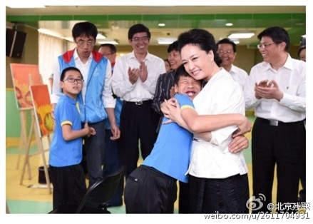 Peng Liyuan, wife of Chinese President Xi Jinping, visits the Beijing Disabled Persons Rehabilitation Service and Guidance Center, May 17, 2015. Sunday was the 25th National Day for the Disabled. (Photo from Sina Weibo of Beijing Disabled People's Federation)