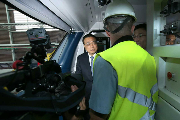 Premier Li talks with the train driver. The train was purchased by the city's Metro system for the new Metro Line 4 for the Olympic Games. Made by China CNR Corp, it was handed over to the local government in February. (Photo/english.gov.cn)