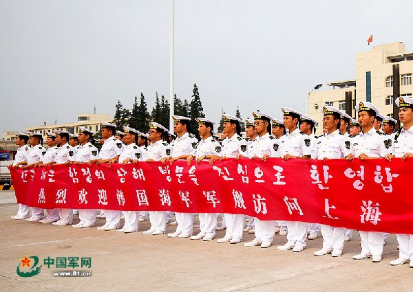Soldiers of the Chinese PLA Navy line up to welcome the visiting guests from the ROK Navy on August 29, 2015. A navy fleet consisted of the guided-missile destroyer Gang Gam-chan and the supply ship ROKS Taechong (AOE-58) from the Navy of the Republic of Korea arrived at the Wusong Military Port in Shanghai, China, on August 29 for a three-day port visit. (Photo/81.cn)