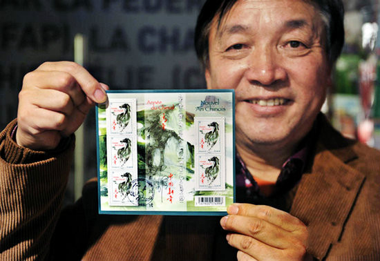 Artist Li Yaozhong and his stamps for the Year of the Horse. (Photo/Xinhua)