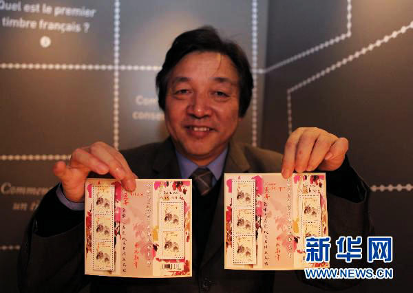 Artist Li Yaozhong and his stamps for the Year of the Rabbit. (Photo/Xinhua)