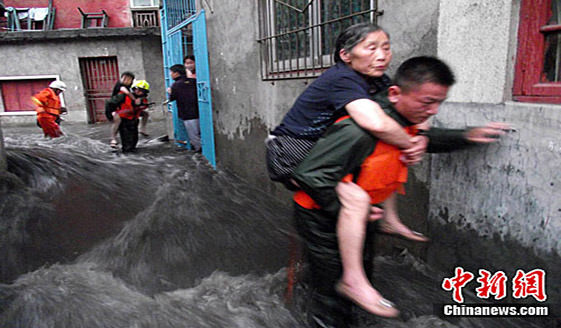 Pingxiang County in eastern China’s Jiangxi Province encountered a rainstorm on June 13, 2011, with rainfall reached over 100 mm in 4 hours. Rescue crews carried out door-to-door searches for flood victims. [Photo/ CNSphoto]