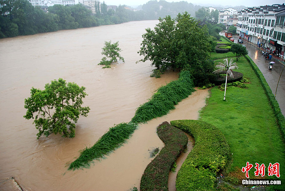 Downpour hit Wuyuan County, Jiangxi Province on June 14, 2011. The local authorities gear up to rescue flood triggered by rainstorms. (CNSPHOTO)