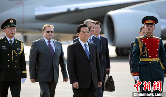 President Hu Jintao arrived in Moscow for a state visit on Wednesday, June 15, 2011. [Photo/ CNSphoto]