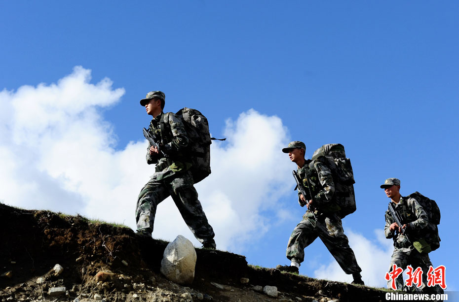 Soldiers of a border defense regiment of the Chinese People’s Liberation Army (PLA) are on a patrol duty in the Tibetan Plateau area at an elevation of 4,300 meters, June 21, 2011. [CNS photo]