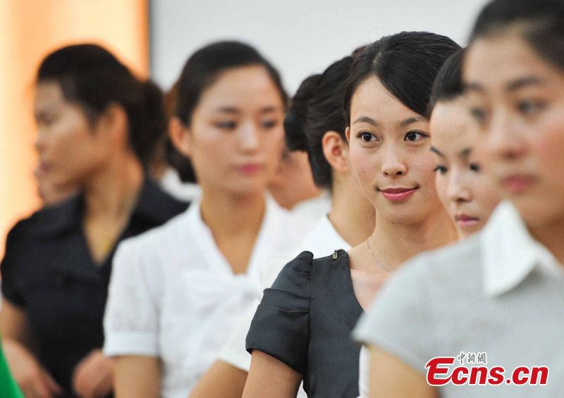 Good-looking young candidates longing to become flight attendants gather at the Lucky Air’s recruitment site in Zhengzhou, central China’s Henan Province on July 3, 2011. [CNS Photo/ Liu Ranyang]