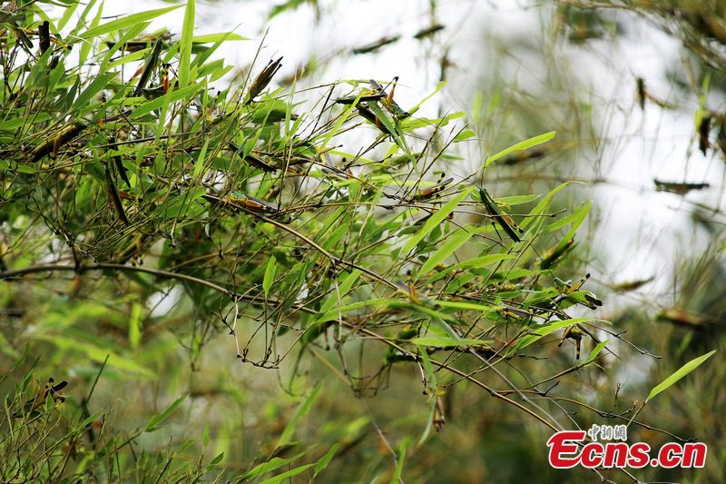 Hot weather and droughts have recently left locusts running wild in some areas in Changsha, south China's Hunan Province. Statistics showed a total of over 30,000 mu (15mu=1hectare) bamboo groves as well as 10,000 mu rice fields are swept across. [CNS Photo/Yang Huafeng]