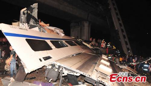 A bullet train in eastern China lost power after being struck by lightning and was rear-ended by another train set out from Beijing on the evening of July 23, 2011, 20:50 (local time). The deadly crash sent four passenger cars careening off an elevated track in Wenzhou, east China's Zhejiang Province. [CNS Photo/He Jiangyong]