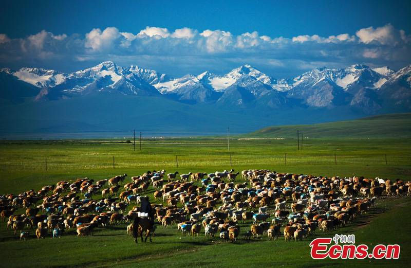 Flocks of cattle, horses and sheep graze in the Bayanbulak Grassland at the foot of the Tianshan Mount. Covering an area of over 23,000 square kilometers, Bayanbulak is the second largest grassland in China, and it is one of the most important pasturing areas in Xinjiang Uyghur Autonomous Region. [CNS Photo/Ma Weiping]