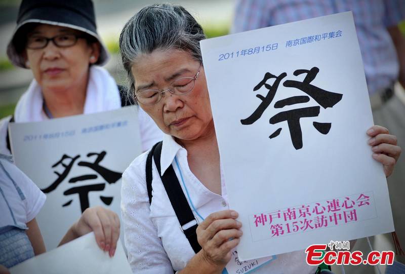 A group of Japanese gathers to mourn victims of the Nanjing Massacre at the square in front of the memorial hall in Nanjing, capital of east China's Jiangsu Province, August 15, 2011, the 66th anniversary of Japan's surrender in the Second World War. [CNS Photo/Yang Bo]