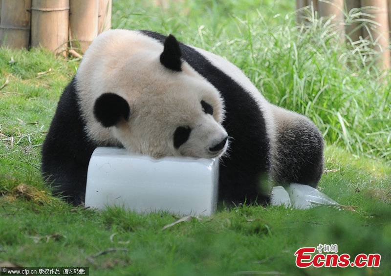 Pandas play with ice cubes to cool off in summer heat at the Chengdu Research Base of Giant Panda Breeding, August 17. [CFP Photo]