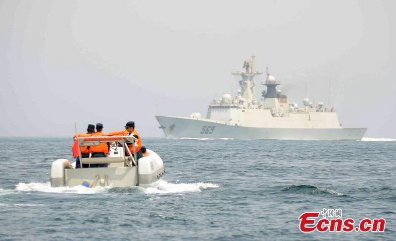 The Ninth Chinese naval escort fleet conducted an anti-pirate emergency exercise in the Gulf of Aden, Somalia August 17, before going into their responsibilities to convoy 360 business fleets. A "pirate" ship is attacking a "merchant" ship. [CNS photo/Li Gencheng]