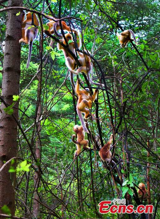 Golden snub-nosed monkeys look for food and play around the Wild Animal Protection Scientific Research Station of Shennongjia Nature Reserve, in August. Traces of this rare species under state first-level protection were first found in 1978 in this area. [CNS Photo/Song Jihe]