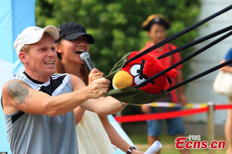 Residents from Changsha, south China's Hunan Province, play Angry Birds game with real giant catapults at Window of the World, a theme park, August 30. [CNS Photo/Yang Huafeng]
