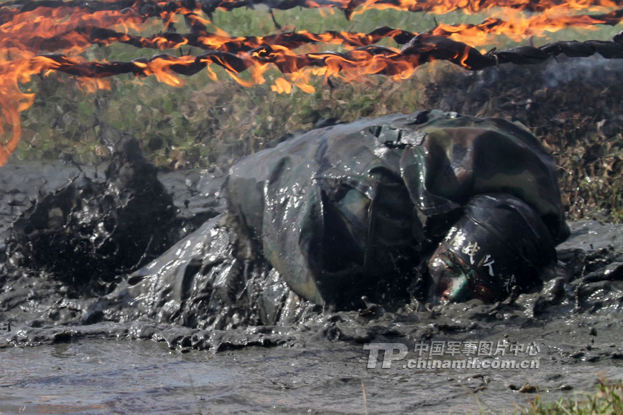A soldier is crawling over an ooze pond. An amphibious armored force of the Marine Corps trains under extreme conditions. [Photo:chinamil.com.cn]