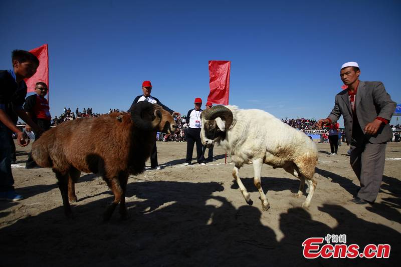 A fierce combat was staged at a ram-fighting contest at the first Nadam Fair held in Jinghe County, Xingjiang Uygur Autonomous Region, September 20. The three-day gathering features 50 traditional sport games. [CNS Photo/Hu Weibin]