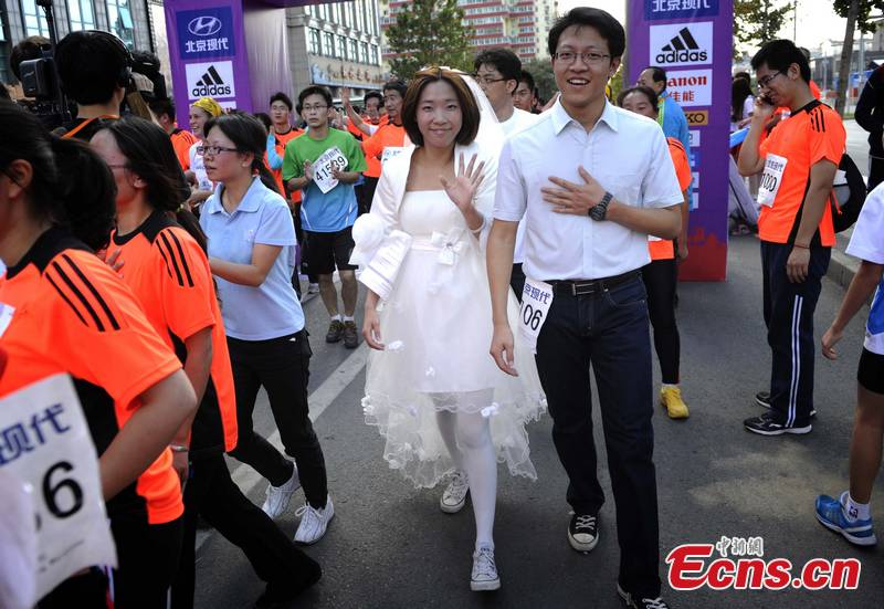A mini-Marathon runner in a white wedding dress poses with her groom at the end-point. The Beijing Marathon 2011 was kicked off at the Tian'anmen Square on Sunday morning. [CNS Photo/Liao Pan]
