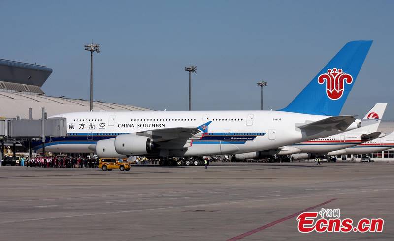 China's first A380 jumbo jet carries out its first domestic commercial flight between Beijing and Guangzhou on October 17, 2011. [CNS Photo/Wang Bo]
