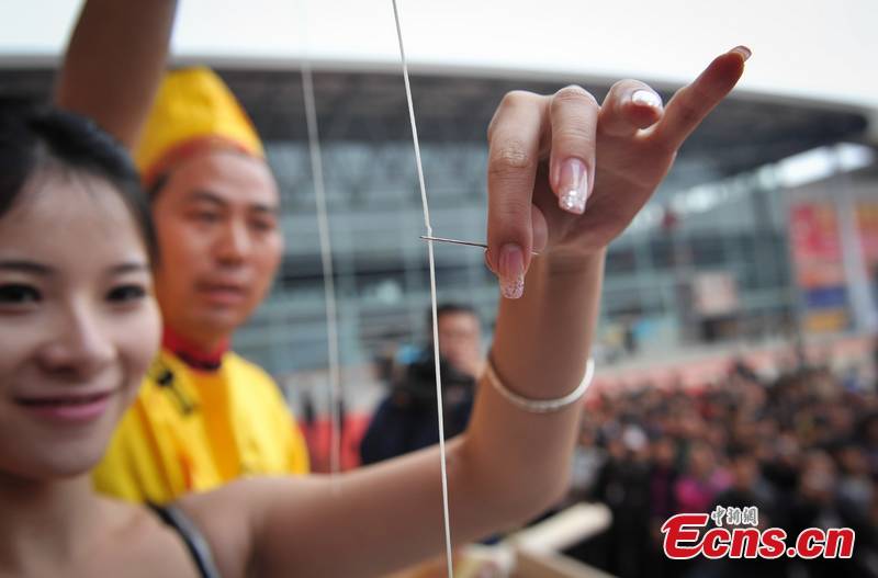 The noodles stretched by Wang Zhonghai, a deft cook, are thin enough to go through the eye of a needle.
