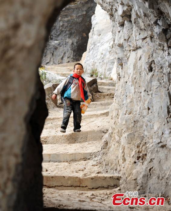 A pupil is on his way to school in Gulu Village, Hanyuan County in southwest China's Sichuan Province. [CNS Photo/Liu Zhongjun]