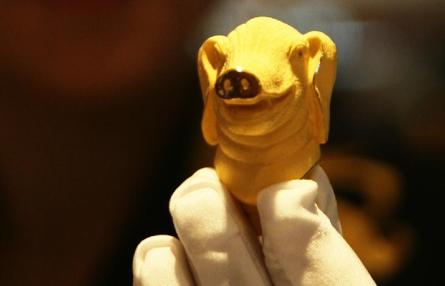 Photo taken on Nov. 13, 2011 shows a gold copy of the pig head sculpture of Yuanmingyuan, the Old Summer Palace, at a shopping center in Nanjing, capital of east China's Jiangsu Province. Once housed at the Old Summer Palace, the heads of 12 bronze sculptures of Chinese zodiac animals were looted by foreign invaders in 1860 at the end of the Second Opium War (1856-1860). Some heads have been bought by patriotic Chinese and donated to the central government. (Xinhua/Shen Peng)
