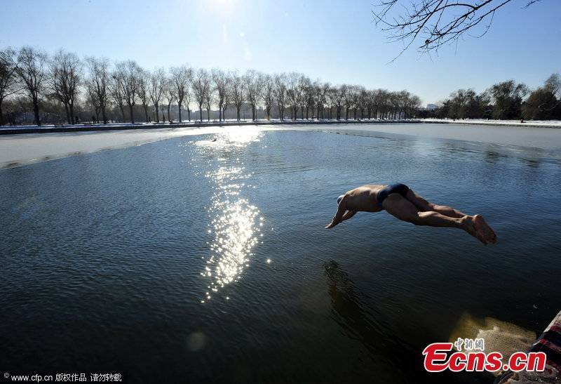 A man dives into an icy pond in Shenyang, northeast China's Liaoning Province, November 23, 2011. The temperature was 16 degrees centigrade below zero. [CFP Photo]