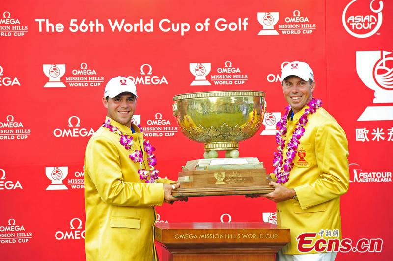 Gary Woodland (left) and Matt Kuchar (right) of the US celebrate with the winner's trophy after their victory in the 56th World Cup of Golf tournament at the Mission Hills golf course in Haikou, capital of south China's Hainan Province, November 27. The American pair ended the US 11-year drought in golf's World Cup by two strokes, and notched the 24th US win in the history of the tournament. [CNS Photo/Luo Yunfei]