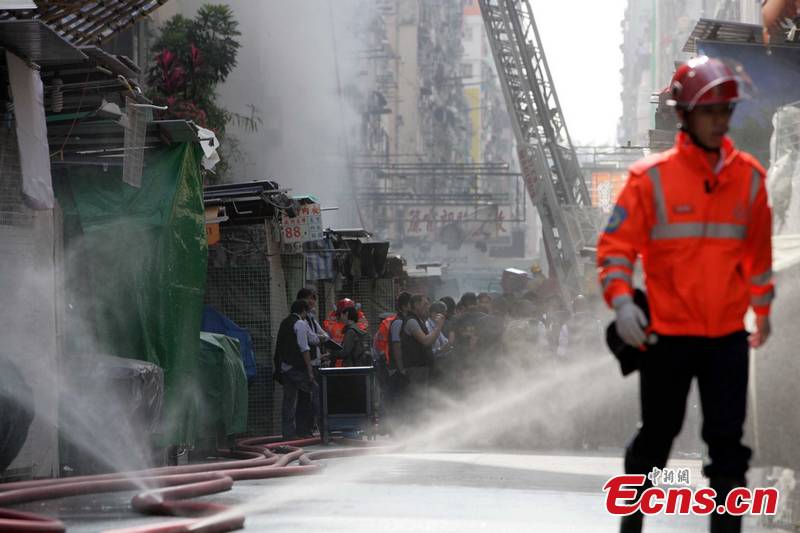 Firefighters work at the scene of a fourth level fire at a market of vendor booths at Mong Kok, Hong Kong, on the early morning of November 30, 2011, which killed nine and injured 24. The injured were hurried to 3 hospitals separately, four of them in serious conditions. [CNS Photo/Hong Shaokui]