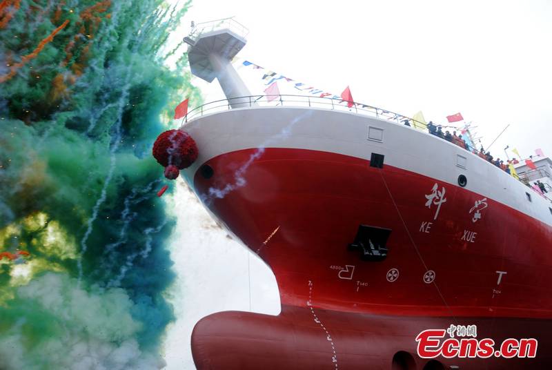 The Chinese research vessel Ke Xue, or "Science" is launched successfully in Wuhan, capital of central China's Hubei Province, November 30, 2011. With a total investment of 550.21 million yuan, the new generation marine craft is expected to be officially put into service in July 2012 as one of Chinese main research ships in future 10 to 20 years. [CNS Photo/Sun Zifa]