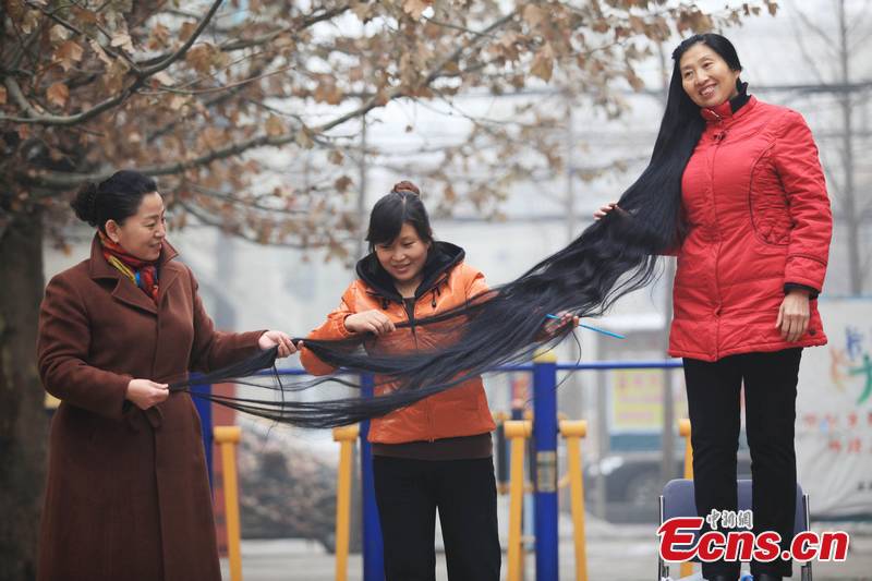Ni Linmei, 55, from Taiyuan, north China's Shanxi Province, shows her 2.53 meters long hair, December 6, 2011. Ni began to grow her hair 14 years ago and expects to try for the Guinness world record in a few years. [CNS Photo/Wei Liang]