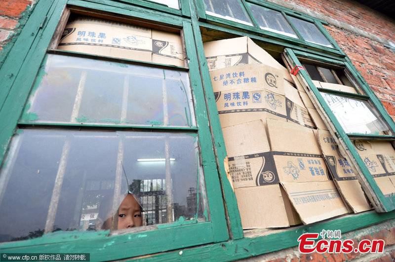 A child looks out through a broken window at the Xingzhi Primary School, which is for children of migrant workers, in Liuzhou, south China's Guangxi Zhuang Autonomous Region, December 7, 2011. As a cold air hits the city, teachers boarded up the windows to keep wind out, which made the shabby classroom even dimmer. [CFP Photo]